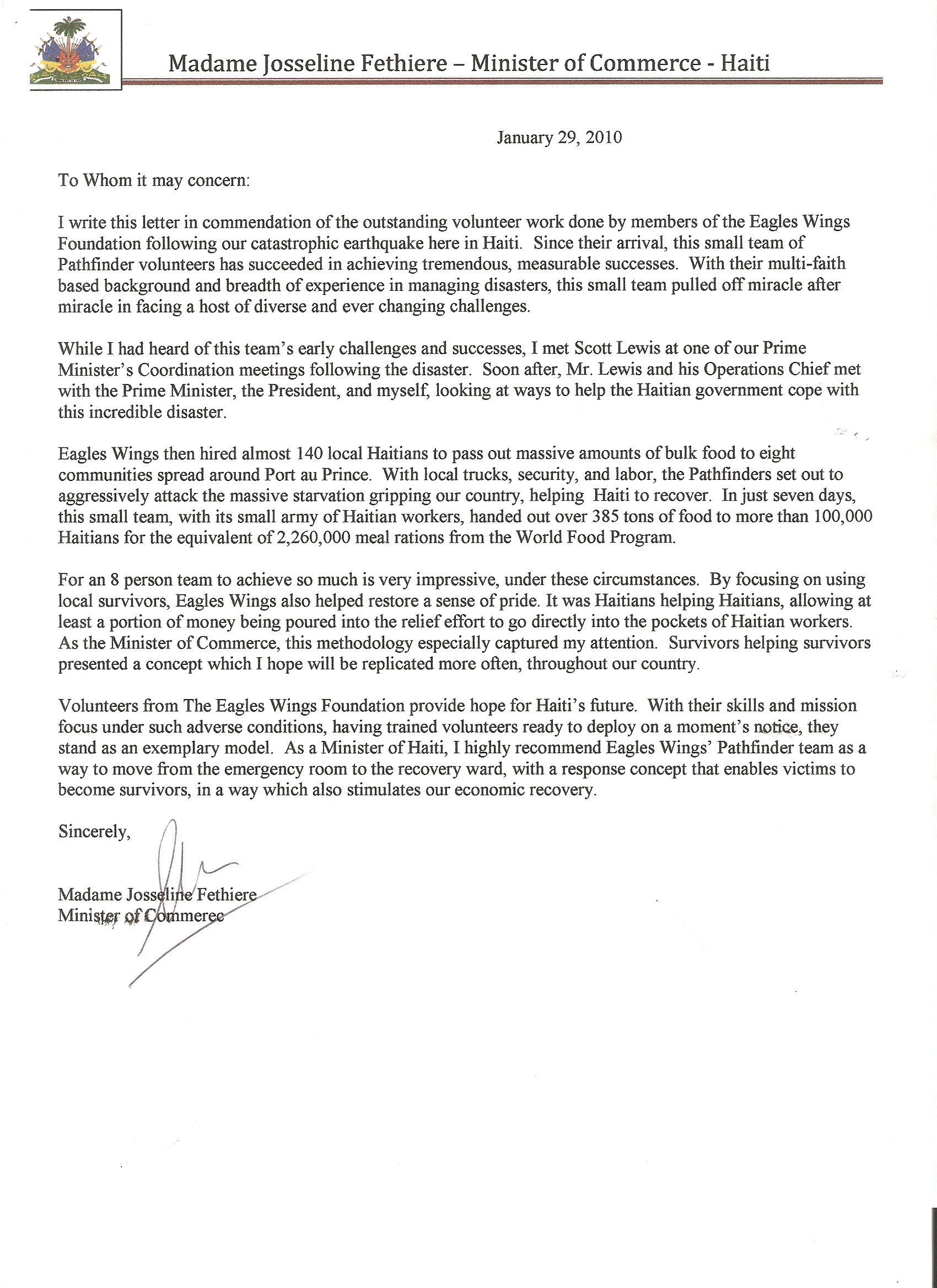 Commendation from Haitian Minister of Finance